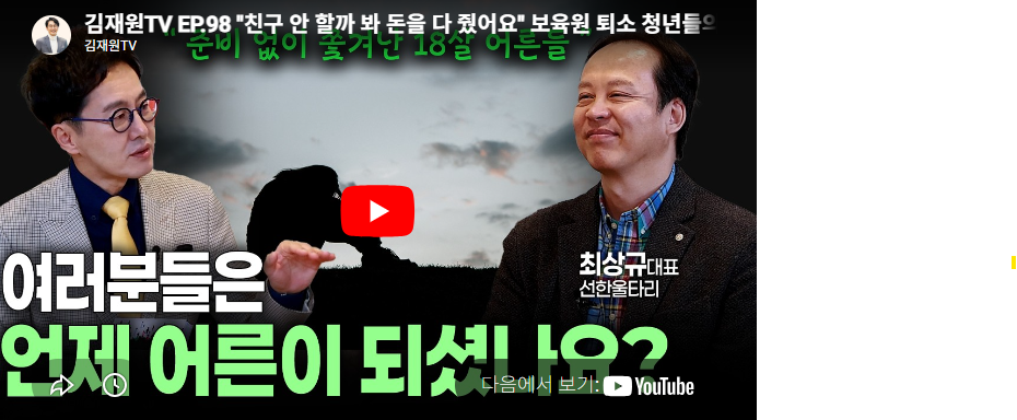 2월 9일 김재원 교수님(전 KBS 아나운서)께서 진행하시는 김재원 TV 녹화가 있었습니다. 2024년 기독교 매거진 ‘빛과 소금’의 인터뷰를 인연으로 알게 된 교수님은 이후로도 항상 따뜻한 공감과 위로로 자립준비청년들의 편이 되어 주십니다. 지난 10월 출간된 ‘선한울타리’ 책을 보내드린 것이 방송 출연까지 이어졌네요. 총 3편의 방송 중 3월 9일 첫 방송을 올립니다. 사역의 홍보를 위해 많이 퍼날러 주세요~