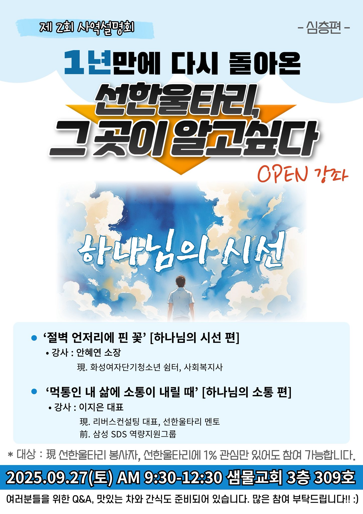 지난 9월 27일 ‘하나님의 시선’이라는 주제로 선한울타리 봉사자와 봉사에 관심있는 성도님들을 대상하는 하는 오픈 멘토심화교육이 있었습니다.