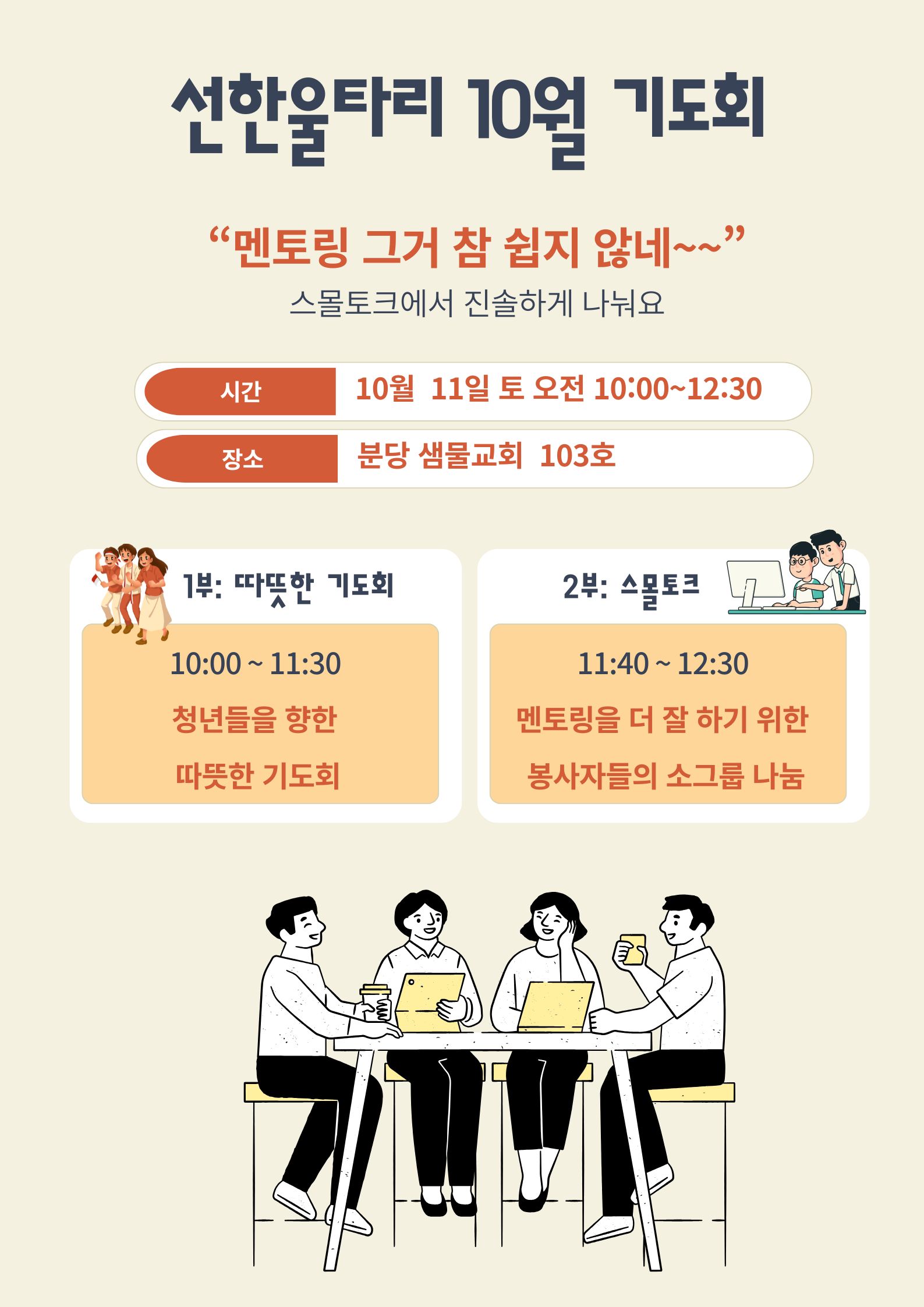 선한울타리 주일 행사로 기도회 일정, 멘토 일정 상 스몰토크 내용도 변경된 점 양해부탁드립니다